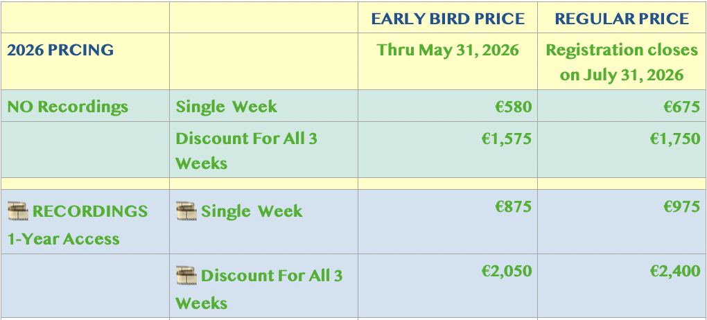 Discounted tuition for all three sessions (total 15 days of classes) is €1750.